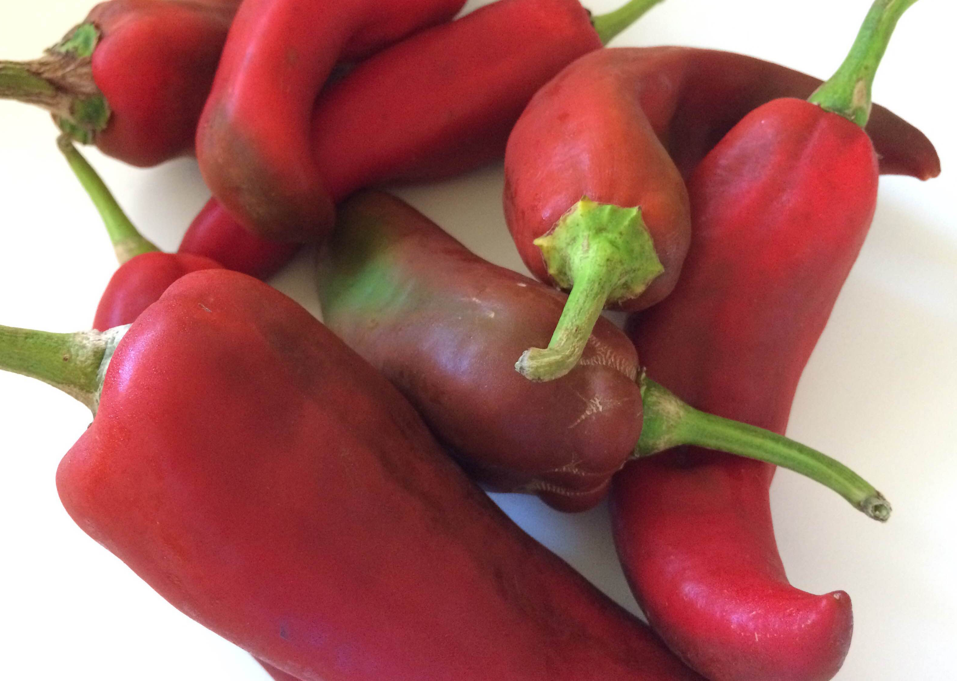 I have been making my own version of stuffed peppers, using chiles from the Upcountry Farmers Market. I’m not sure of the variety, but they are a sweet pepper, so no worries if you aren’t into a good mouth burn, which I happen to love. You can use any chiles you like; poblanos are a particular favorite of ours. The stuffing here is not meat, but what we call Crusty Beans.