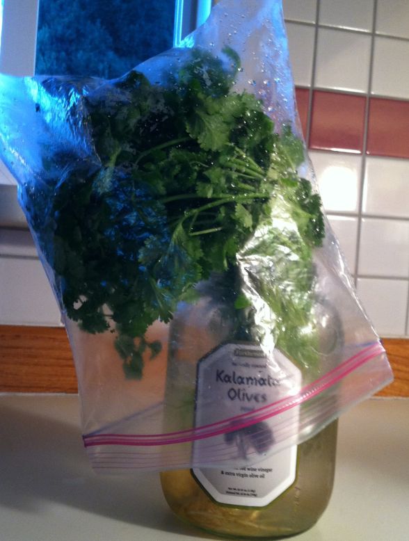 The cilantro is washed & happy in its jar, which was formerly the home of kalamata olives.
