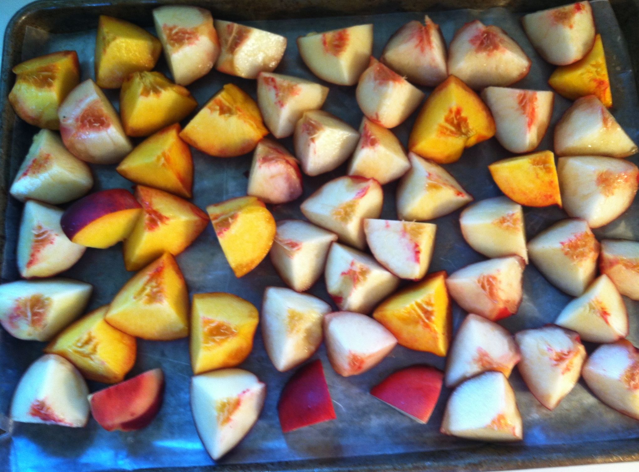 . . .you may not want to use up your whole flat of peaches for preserves. Here is what we do with them-we cut them in eighths, then put them on a cookie sheet lined with parchment or waxed paper {they will stick to the cookie sheet and be hard to remove if you don’t line it}.