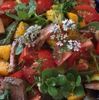 Salad of Greens, Mangoes, Tomatoes, Purslane and Steak